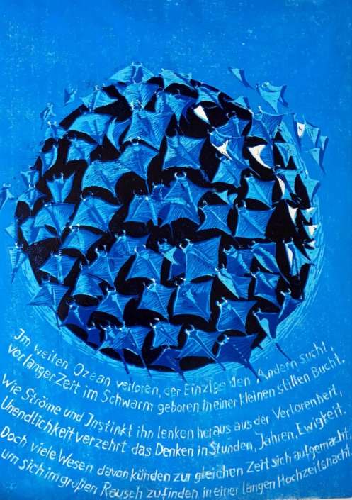 In den Holzschnitten zu eigenen Gedichten sind schwarz- weiß- graue Drucke mit Text. Dort habe ich mit der dunkelsten Farbe begonnen und ehe ich die helleren Farben gedruckt habe, immer die dunklen Teile ausgeschnitten., dann wieder geschnitten, gedruckt, bis zur hellsten Farbe. Das nennt man verlorene Form. Diese Druckplatten lassen sich kein zweites Mal drucken. Es bleibt die eine Auflage von 10 Blättern. Auch bei den farbigen Blätter verwende ich verlorene Form. Die selbe Platte sorgt für Passgenauigkeit und behält die eigene Holzstruktur bei.